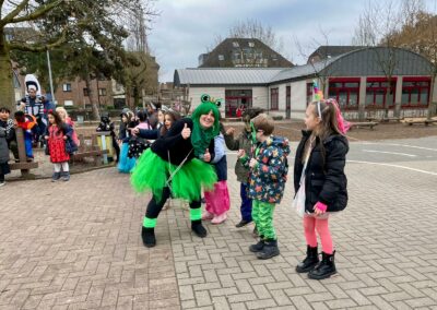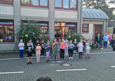 Im Rahmen einer kleinen Abschiedsfeier auf dem Schulhof wurde er dann auch gebührend verabschiedet. Gemeinsam sangen alle Kinder, Lehrerrinnen und OGS Mitarbeiterinnen ein eigens für ihn umgedichtetes Lied und geleiteten ihn anschließend mit einem Spalier aus Zollstöcken symbolisch vom Schulhof.