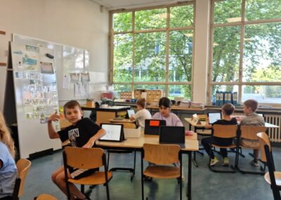 Ein ganz besonderes Ereignis an diesem Tag war für uns die persönliche Übergabe der Startchancen Plakette durch die Schulrätin Frau Wardenbach und den Leiter des Schulverwaltungsamtes Herrn Finke. Nach einem sehr schönen Grußwort und einer kurzen Erläuterung des Startchancen Projekts, gingen wir mit den Klassensprechern in unseren Projektraum, wo wir ein gemeinsames Foto für die Presse erstellten. Nebenbei informierten sich Frau Wardenbach und Herr Finke bei den anwesenden Kindern über den im Rahmen des Startchancenprogramms neu eingerichteten Projektraum.
