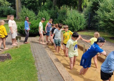 Am 11.06.2025 unternahmen die zweiten Klassen einen spannenden Ausflug zum Barfußpfad. Bei bestem Wetter machten sich die Kinder auf den Weg, um die verschiedenen Untergründe mit bloßen Füßen zu erkunden. Ob kühles Wasser, pieksiger Kies oder weicher Waldboden – die Schüler*innen erlebten die Natur mit allen Sinnen. Besonders viel Spaß machte das Balancieren auf Holzstämmen und das Laufen durch matschige Abschnitte.
