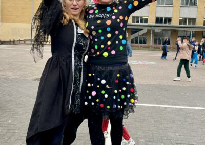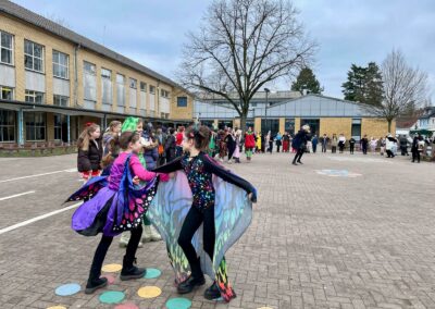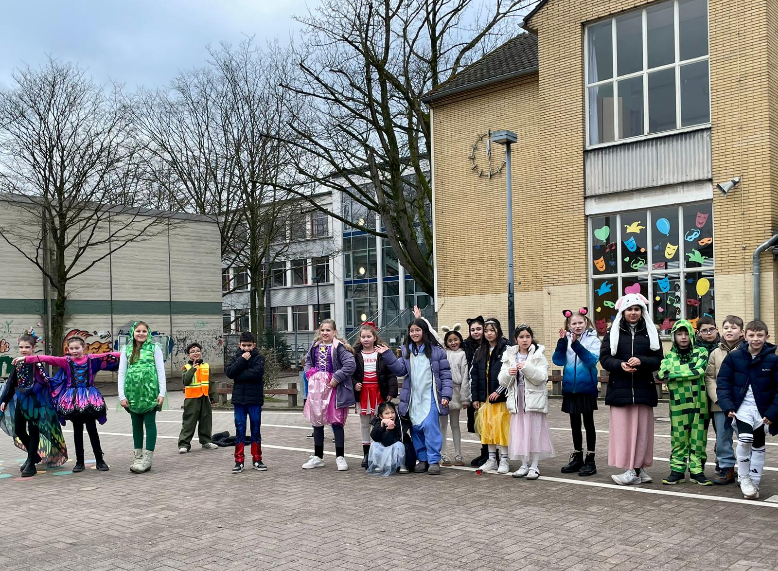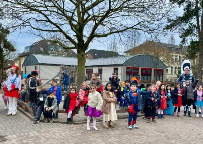 Zum Dank bildeten die Schülerinnen und Schüler ein Spalier und überreichten Frau van Husen Tulpen. Auch das Lehrerkollegium, sowie die Mitarbeitenden der OGS ließen es sich nicht nehmen, Frau van Husen mit liebevoll ausgewählten Geschenken zu überraschen.